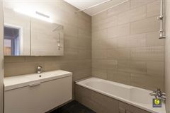 De moderne badkamer is volledig betegeld en voorzien van een wasmeubel met spiegelkast, een bad-/douchecombinatie en mechanische ventilatie.