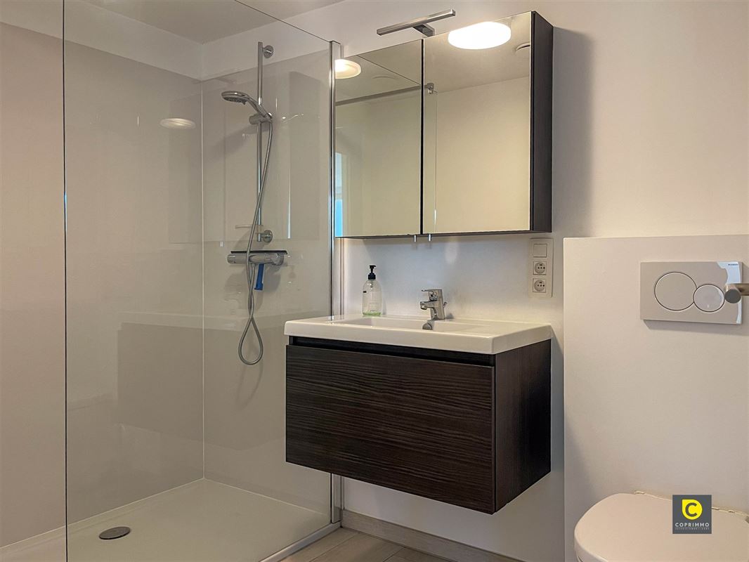 De badkamer heeft een inloopdouche, lavabomeubel en toilet.