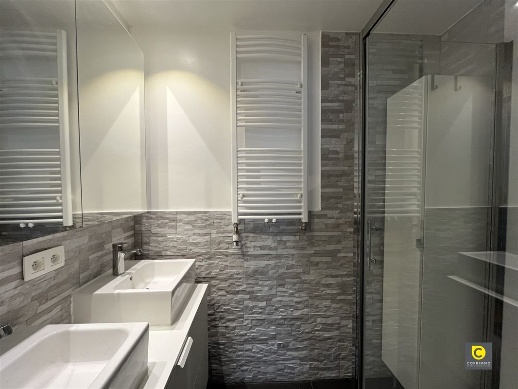De badkamer is uitgerust met een douche en dubbele lavabo met bijhorend meubel.