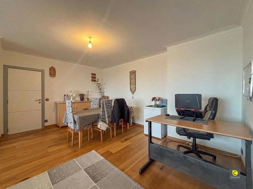 De aangename leefruimte op parket baadt in het licht dankzij de grote raampartijen en biedt rechtstreekse toegang tot het ruime terras aan de voorzijde.