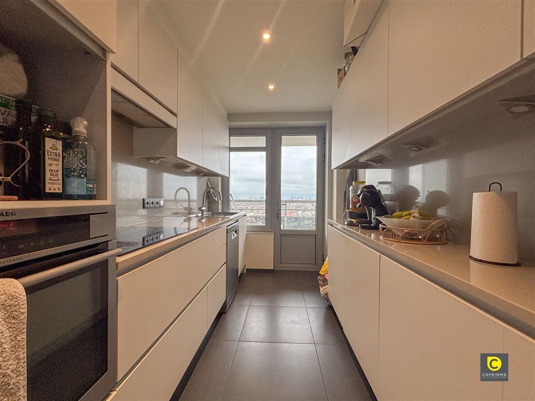 De recent gerenoveerde keuken, afgewerkt met onderhoudsvriendelijke tegels, is volledig uitgerust met oven, inductiekookplaat, dampkap, vaatwasser, spoelbak en biedt ruime kast- en werkruimte.
