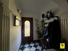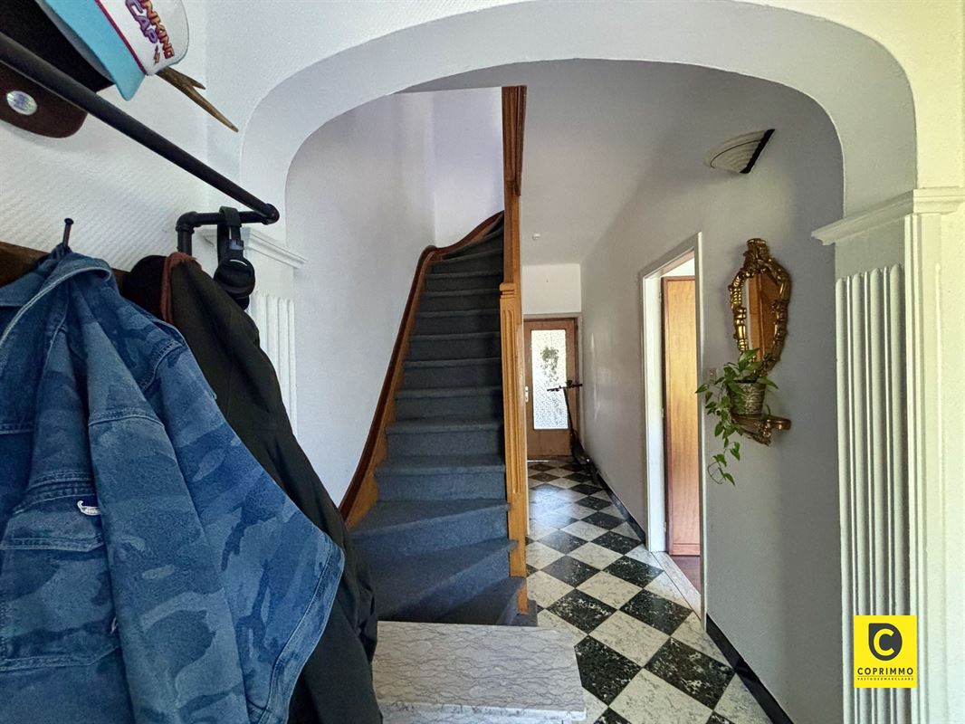 Binnenin wordt u verwelkomt in een authentieke inkomhal met geblokte vloer en trap aan de linkerkant die u naar de eerste verdieping van het huis brengt.