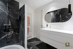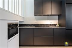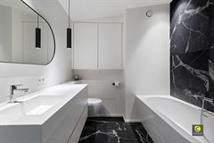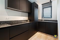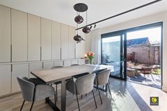 De ruime, aparte inkomhal omvat een ingemaakte kastenwand als vestiaire en huisvest het gastentoilet met handenwasser. Reeds bij het betreden van de woning gaat de aandacht meteen uit naar de luxueuze afwerking in combinatie met het huiselijk gevoel en een onberispelijke staat van onderhoud. De gezellige leefruimte ligt aanpalend de tuin en geniet met dank aan de grote raampartijen een mooie natuurlijke lichtinval, dewelke onder meer de karaktervolle keramische parketvloer, de ingemaakte kastenwand met bureau en alle design-verlichting nog meer in de verf zet. De strakke keuken met prachtig, gemarmerd (keramisch) werkblad in combinatie met de mat-zwarte fronten, is een ware droom voor wie al eens graag achter de potten staat en omvat kwalitatieve toestellen (inductievuur, dampkap, oven, vaatwasser, koelkast, vriezer, anderhalve lavabo). Bijkomend is er nog een aparte berging/wasruimte waar ook de ketel, het ventilatie- en regenwater recuperatiesysteem is ondergebracht.